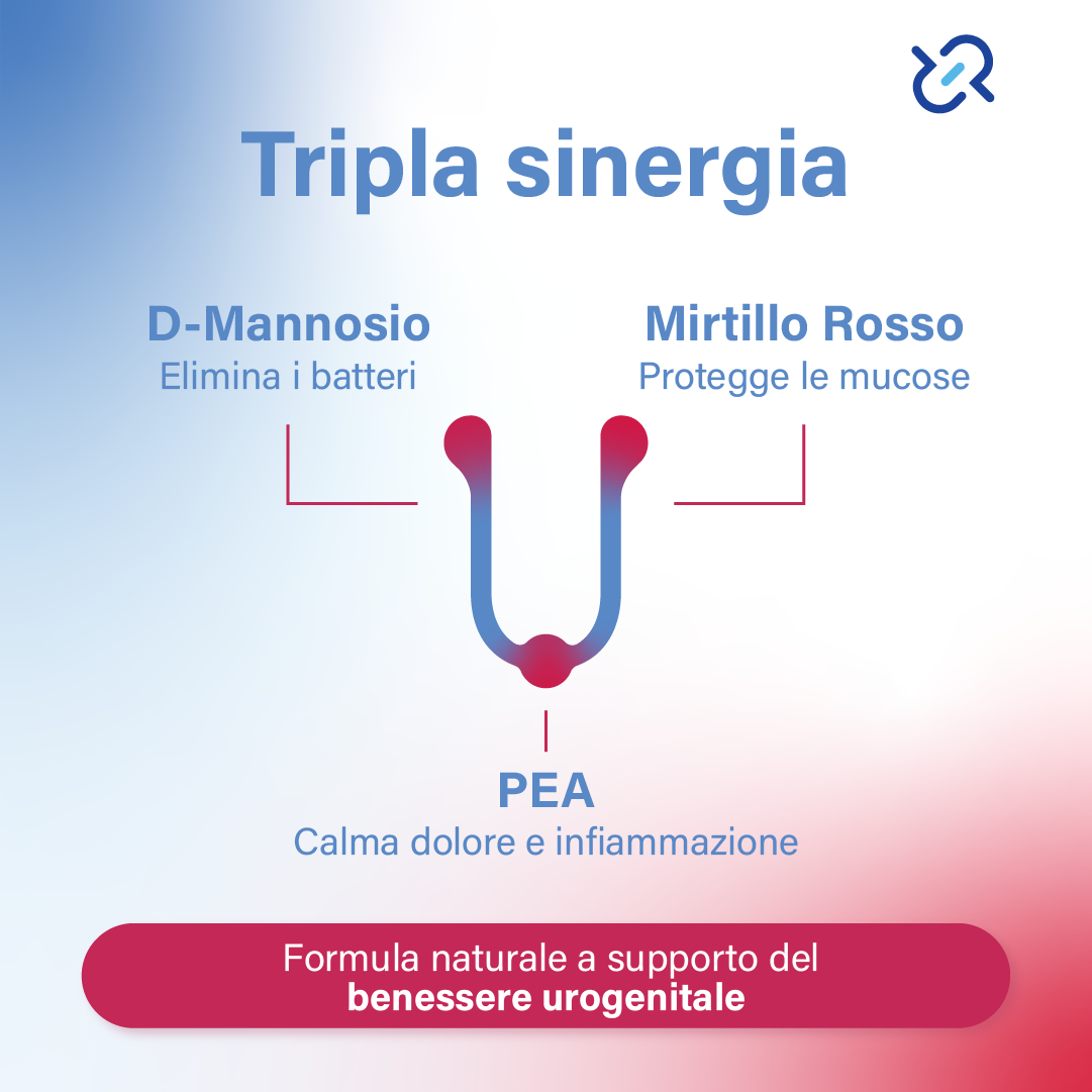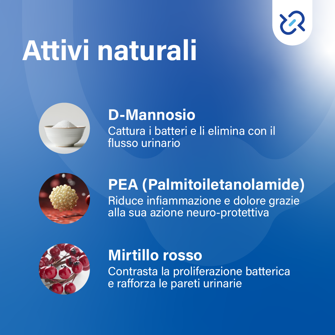 Integratore alimentare in stick orosolubili al gusto di Frutti di bosco a base di D-Mannosio, PEA e Mirtillo rosso. Supporta il benessere delle vie urinarie e nella prevenzione delle infezioni del tratto urinario, come la cistite.